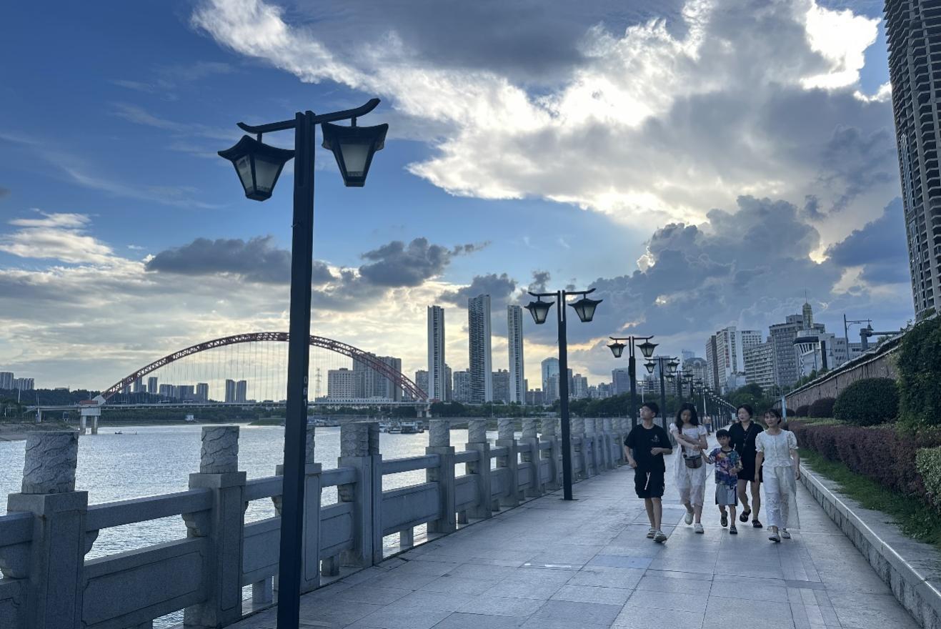 2025年7月23日傍晚,游客在龙王庙江边散步
