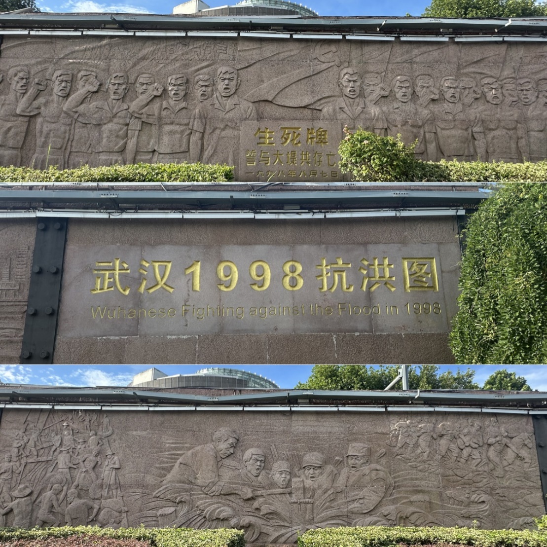 站在临江护岸长廊放眼远望,“龟蛇”两山对峙,黄鹤楼、晴川阁两两相望,长江一桥、晴川桥等城市景观尽收眼底;俯瞰两江,水上船来船往,黄金水道交通繁忙,长江水和汉江水交汇处波澜不惊。身后的防水墙上,是一幅长110米、高3.46米的1998抗洪纪实浮雕,无声叙说着那场惊心动魄的抗洪史诗,铭刻着那不朽的二十四字抗洪精神。